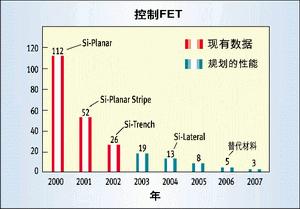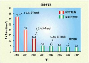 圖2所示的是同步或稱低端(low-side)FET的品質(zhì)因數(shù)。在這里,實(shí)際上是傳導(dǎo)損耗主宰了處在導(dǎo)通電阻時(shí)域的品質(zhì)因數(shù)。僅在過去的兩年中,通過將1至2微米溝道技術(shù)升級(jí)為深亞微米水平,就使品質(zhì)因數(shù)提高了約3倍,今后還有更多的改進(jìn)余地。