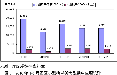 觀察1-5月國產(chǎn)小型轎車與大型轎車生產(chǎn)情形(圖1),小型轎車1月份的產(chǎn)量遠(yuǎn)高于其他月份,乃部分產(chǎn)量對應(yīng)2009年貨物稅減徵期間尚未消化的訂單,另外2月份較少的生產(chǎn)日數(shù)造成整車產(chǎn)量為各月中最低者,特別是大型轎車的部分。 相較于2010年第一季,預(yù)估第二季整車總產(chǎn)值衰退1.28%,小型轎車產(chǎn)值衰退8.5%,而大型轎車產(chǎn)值則有36.2%的成長。