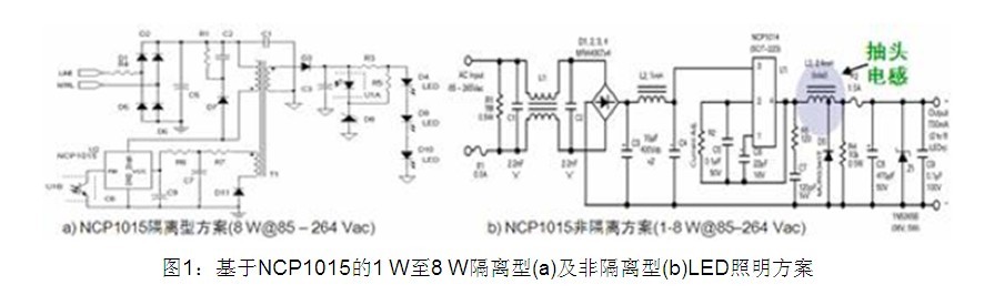 1W至8W的低功率LED通用照明應(yīng)用包括G13、GU10、PAR16、PAR20和嵌燈等。這類應(yīng)用的輸入電壓范圍在交流90至264 V之間,恒流輸出電流包括350 mA和700 mA兩種,能效要求為80%,還要求提供短路和過(guò)壓保護(hù)等特性。這類應(yīng)用可以采用安森美半導(dǎo)體的NCP1015自供電單片開(kāi)關(guān)控制IC。該器件集成了固定頻率(65/100/130 kHz)電流模式控制器和700 V的高壓MOSFET,具備構(gòu)建強(qiáng)固的低成本電源所需的全部特性,如軟啟動(dòng)、頻率抖動(dòng)、短路保護(hù)、跳周期、最大峰值電流設(shè)定及動(dòng)態(tài)自供電功能(無(wú)需輔助繞組)等。NCP1015既可用于隔離型方案,也可用于非隔離型方案,見(jiàn)圖1。