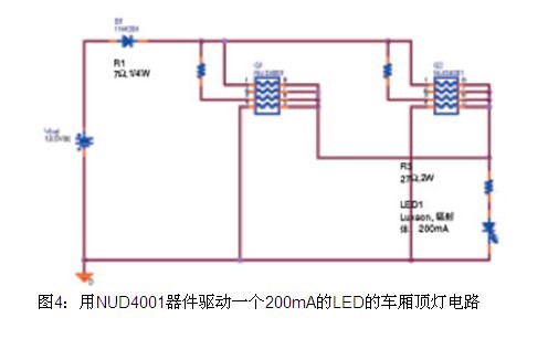 NUD4001提供了一種滿足汽車應(yīng)用的低成本解決方案。與采用線性或開(kāi)關(guān)穩(wěn)壓器相比,它的設(shè)計(jì)更簡(jiǎn)便,可以構(gòu)成更簡(jiǎn)單而且成本更低的電路,見(jiàn)圖4。