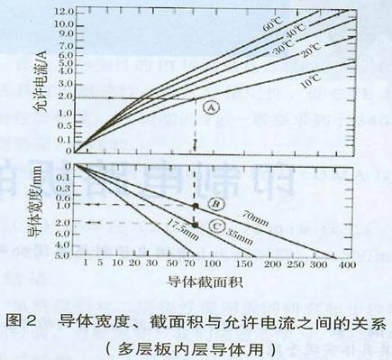 值得注意的是,當(dāng)導(dǎo)體圖形溫度上升到85℃左右時,絕緣材料自身開始發(fā)黃(圖1),電流繼續(xù)通過,最后銅圖形熔斷,特別是多層板內(nèi)層圖形,周圍都是傳熱性差的樹脂,散熱困難,因而溫度不可避免地上升,所以特別要注意導(dǎo)體圖形線寬的設(shè)計。實際上在進行PCB布線設(shè)計時走線線寬主要依據(jù)其發(fā)熱量和散熱環(huán)境來確定的。銅導(dǎo)體的截面積決定了導(dǎo)線電阻(數(shù)字電路中線電阻引起的信號損耗可忽略不計),銅導(dǎo)體和絕緣基材的導(dǎo)熱率影響溫升,進而決定載流量。圖2是普通FR-4覆銅箔板銅導(dǎo)體圖形線寬及截面積與允許電流之間的關(guān)系圖。從圖中可以看出:導(dǎo)體圖形截面積一定,當(dāng)其允許電流值為2A,溫度上升值低于10℃時,對于35Um銅箔,其線寬應(yīng)設(shè)計為2mm:對于70um銅箔,其線寬應(yīng)設(shè)計為lmm。由此得出:當(dāng)導(dǎo)體的截面積、允許電流和溫度上升值一定時,可通過增加銅箔厚度或加大線寬值兩個方面來滿足走線的散熱要求。