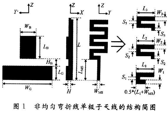 非均勻彎折線的單極子天線結構如圖1所示。基板選用Rogers4350B基板,厚度為0.762mm,相對介電常數為3.48。為了分析方便,將輻射元分成了3段;天線的饋電采用了50Ω的微帶線。