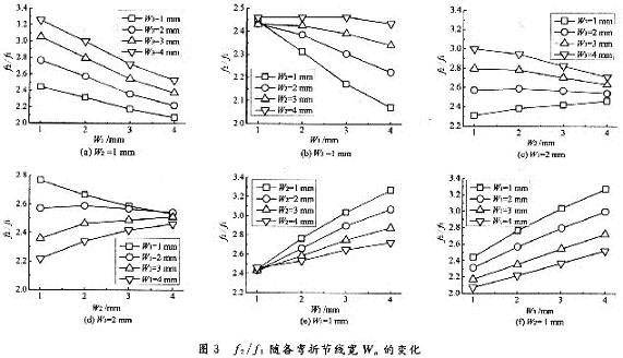 依次改變各彎折節的線長Ln(n=1,2,3)和線寬Wn(n=1,2,3),計算出天線的第一諧振頻率f1和第二諧振頻率f2。通過比較f2/f1的變化來研究各彎折節幾何參數對天線諧振特性的調節作用。