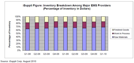 iSuppli指出,觀察全球前五大電子制造服務(wù)(EMS)的最新庫(kù)存狀況顯示,在2010年第一季,零組件與原材料占據(jù)近七成的總庫(kù)存量;相對(duì)來(lái)看,在制品(work-in-process goods)占據(jù)總庫(kù)存量的比例為17%,成品(finished goods)所占比例則低于15%。