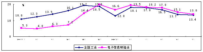 圖1 2009年7月至今規模以上電子信息制造業與全國工業增加值增速對比