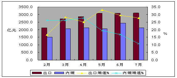 圖2 2010年前7個月出口與內銷增速對比