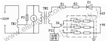 圖中TM1為調壓器,TM2為高壓變壓器,TM2產生的高壓經高壓二極管D1整流得到0~3萬伏(峰值電壓)的直流高壓。高壓電阻R1、R2為限流電阻,我們以電壓表V來間接指示實際的高壓值,也就是以高壓變壓器TM1初級的低壓送入電壓表,其表頭上指示的電壓數值是根據高壓變壓器初、次關系換算后的高壓值。這樣處理既可節約成本又可保證安全。本設備將P21點電壓送至另一比較環節,此電壓與設定的泄漏電流比較來控制是否聲光報警,以此剔除不合格品。由于電池殼的材質略有不同,空氣濕度也有變化,各種因素都可能引起合格電池殼情況下P21點的電壓發生微小變化,這種變化已足以導致設備誤判斷。為了解決這種問題,我們在主回路中串入了不同的電阻(虛線框中),以調節旋鈕SA來作出選擇,用以抵消各種影響,可避免設備的誤判斷。
