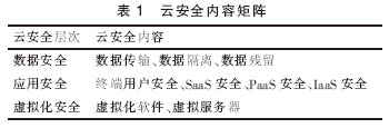 云安全架構(gòu)的一個(gè)關(guān)鍵特點(diǎn)是云服務(wù)提供商所在的等級(jí)越低,云服務(wù)用戶自己所要承擔(dān)的安全能力和管理職責(zé)就越多。下面對(duì)云計(jì)算安全領(lǐng)域中的數(shù)據(jù)安全、應(yīng)用安全和虛擬化安全等問(wèn)題(見表1)的應(yīng)對(duì)策略和技術(shù)進(jìn)行重點(diǎn)闡述。