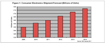 預計2011年消費電子產(chǎn)品出貨量將達到16億個,而2010年是15.6億個。消費電子包括多種我們熟悉的產(chǎn)品,消費者每天都會用到,如電視、立體聲和音頻部件、便攜媒體播放器、機頂盒、游戲機、DVD和藍光播放器、數(shù)碼相機、投影儀和攝像機、數(shù)字相框、電子書閱讀器和消費電器。