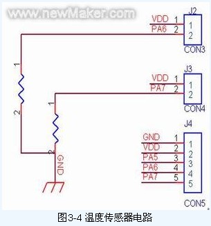 J2和J3是溫度傳感器的兩個接口,其中J2和J3分別是頂蓋和底盤溫度傳感器的接口,單片機檢測的信號實際上是與溫度傳感器分壓的電阻的電壓值,由于溫度傳感器的電阻值會隨溫度的上升而減小,所以分壓電阻的電壓值間接反映了某一時刻的溫度,電路原理圖如圖3-4所示: