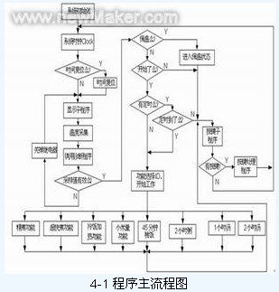 從樣機分析中大致設計整個系統,整個系統輸進包括2個溫度傳感器,5個按鍵;輸出包括2位七段數碼管、10個發光二極管、繼電器控制信號等。根據控制功能,將程序設計為幾個主要的模塊,程序主流程見圖4-1所示: