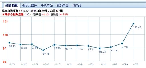 需要特別指出的是,四大成分指數之一的電子元器件指數的漲幅最為明顯,本期指數從3月14日的102.47點,漲到了110.53點,漲幅為7.87%,也是3年來之最??磥?,日本地震對華強北指數的影響也是達到了峰值,也充分說明,華強北電子元器件市場已經受到了日本地震的強烈沖擊。