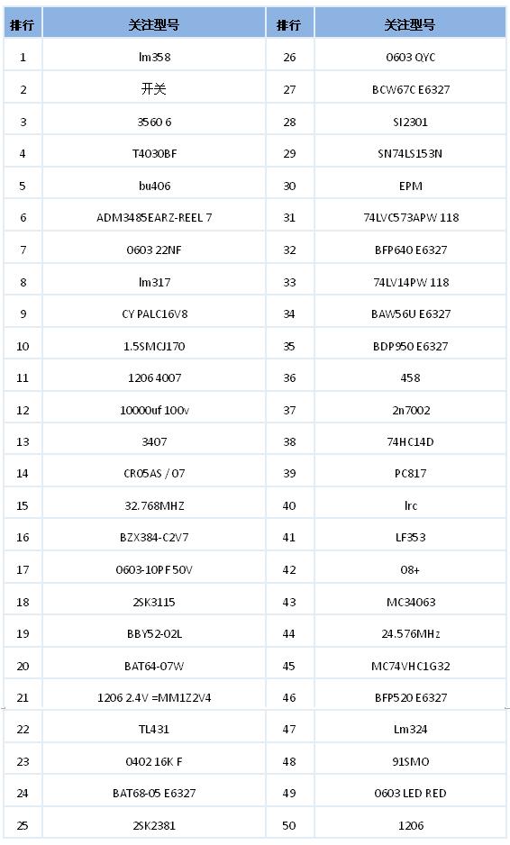 - 過去一周商家關注的IC型號排行榜top50一覽