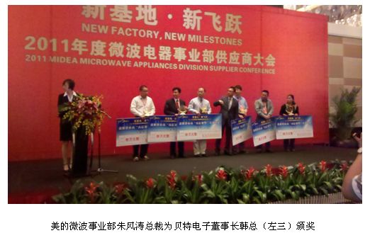 2011年4月14日(星期四),貝特電子科技有限公司應邀出席廣東美的集團舉行的2011年度微波電器事業(yè)供應商大會和新基地落成典禮,在此次盛會中,來自海內外的供應商和客戶參加了此次為期兩天的盛會,期間美的將從其900多家供應商中選出20名最佳供應商授予新年度“戰(zhàn)略供應商”大獎。新基地也進一步印證了美的的”5年再造一個美的”的宏偉戰(zhàn)略,這對我們全體供應商均是一個再上臺階的機會。