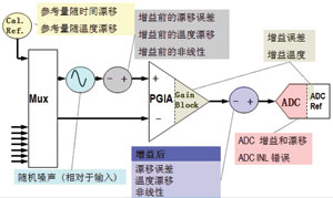 相對(duì)而言,精度的概念是指測(cè)量值與“真實(shí)”值之間的最大偏差的絕對(duì)值。如圖1所示,信號(hào)在整個(gè)數(shù)據(jù)采集系統(tǒng)中會(huì)受到參考量隨時(shí)間、溫度的飄移誤差、隨機(jī)誤差、非線性誤差、增益誤差等影響,這些影響綜合之后對(duì)測(cè)量結(jié)果所產(chǎn)生的影響就是我們所說(shuō)的測(cè)量精度。