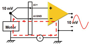 接地環(huán)路會(huì)嚴(yán)重影響測(cè)試結(jié)果,例如,在圖4所示的電路中,為了能夠長(zhǎng)時(shí)間監(jiān)測(cè)一個(gè)電機(jī)的溫度,在電機(jī)上連上一個(gè)熱電偶傳感器,由于電機(jī)箱是接地的,因此熱電偶也接地,而數(shù)據(jù)采集設(shè)備地與電機(jī)箱地之間存在電勢(shì)差,因此產(chǎn)生了電流。你可以注意到,加在測(cè)試信號(hào)的噪聲可能是交流的,或者一個(gè)簡(jiǎn)單的直流偏移值,但最終無(wú)可避免地影響了測(cè)試精度。