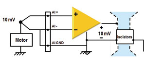 為了避免接地環(huán)路,需要選擇合適的接地模式,特別是在測(cè)量一個(gè)接地傳感器時(shí),應(yīng)該盡量避免使用單端輸入方式(RSE),這種方式會(huì)直接在數(shù)據(jù)采集設(shè)備與傳感器地間產(chǎn)生電流。如果使用的是差分方式(DIFF),由于電路為開(kāi)路,因此電流被制止,從而較好地抑制了接地環(huán)路。當(dāng)然,相比于差分,通過(guò)隔離技術(shù)(見(jiàn)圖5),可以在不讓兩個(gè)地相連,分隔數(shù)據(jù)采集設(shè)備地的同時(shí),保持?jǐn)?shù)據(jù)值的傳輸,從而從根本上解決了環(huán)路問(wèn)題.
