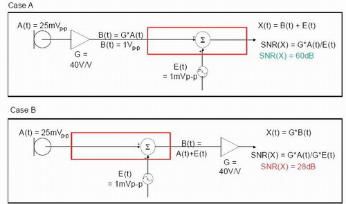 圖1:放大器位于不同位置將產生不同的信噪比。