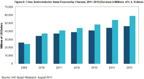 圖中所示為IHS iSuppli公司對中國半導(dǎo)體銷售額的預(yù)測,按渠道細分。