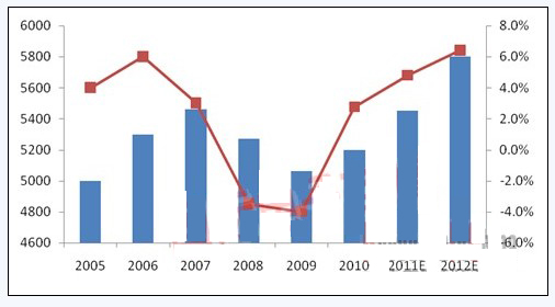 2005-2012E全球鋁電解電容器銷售額及同比增速(百萬美元)