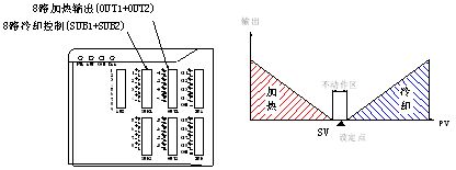 DTE10T在擴展輸出模塊后,SUB1輸出口可定義為冷卻輸出控制。利用雙PID計算,在溫度沒有沖過設定值時,溫控器就可提前啟動冷卻風機,避免了溫度從高不下的情,并能保持溫度穩定性。個人認為報警驅動的冷卻模式總將由于控溫不穩定等原因被淘汰。雙PID控制方式必定是追求更高控溫精度的首選。如圖5所示。