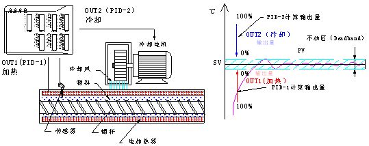 DTE不僅帶來了操作界面的變革,它提供的雙PID控制方式(雙向控制)更能為擠出機控溫效果帶來提升。所謂雙向控制,就是溫控器提供兩組輸出,一組為加熱,另一組為冷卻。在兩組輸出交替或共同運行的情況下很好的穩定控制溫度。在某些有自發熱的情況下,能很好的應用。擠出機在擠出物料時由于摩擦原因,自發的熱量不容小視。雖然在擠出的開始需要電熱器大量熱量補給,但是隨著不斷的擠出。摩擦生成的熱量將是溫度過沖的主要原因。