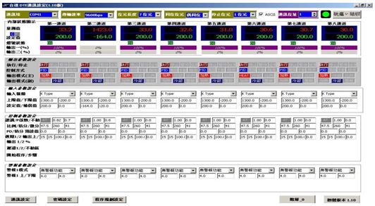 DTE對于參數的設置完全可以采用DTE專用的PC軟件來完成,全中文的DTE設置畫面簡單明了。不動區等參數需要結合現場實際工況來分析與設定。塑料擠出機一般可設置在:0.~2之間,而PID參數可以借助AT自動完成。