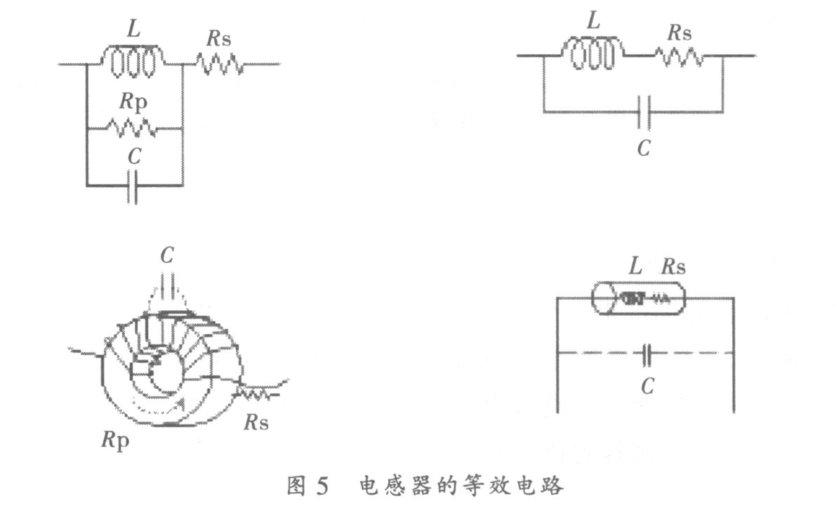 電感器由纏繞在磁芯上的導線構成, 其特性則由所使用的磁芯材料決定??諝馐菢嫵呻姼衅髯詈唵蔚拇判圆牧希?但為使電感器具有更高的電感量,經常用鐵、鐵氧體等磁性材料做磁芯。電感器的典型等效電路如圖5 (a) 所示, 圖中Rp 代表磁性的鐵耗, Rs 代表導線的銅耗, C 是繞線間的分布電容。對于低值電感應使用圖5 (b) 所示的等效電路。由于L 值很小, 繞組間的分布電容就成了主要的影響因素。