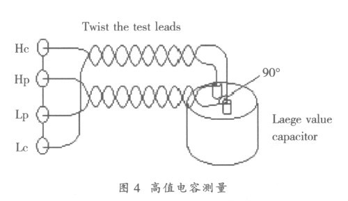 在電容器的測量中, 應注意的事項與被測電容量有關, 高值電容測量屬于低阻抗測量, 因此必須把接觸電極、測試夾具和電纜中的接觸電阻及殘余阻抗減到最低, 應使用4 端、5 端或4 端對配置把DUT 接到儀器上。在使用4 端和5 端配置時, 必須確保高測試信號電流流過電纜, 為避免電磁場耦合的影響, 按圖4 所示的方式來連接電纜;此外, 為進行精確測量, 應正確使用開路、短路補償。特別是對于施加直流偏置電壓的電解電容器,應在直流偏置設置為ON (0 V) 時進行開路/短路補償。