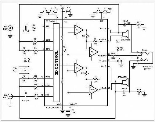 圖1所示的立體聲聲頻子系統(tǒng),是一個包含立體聲聲頻喇叭加耳機(jī)和3D增強(qiáng)裝置的放大器。也就是說,這個裝置具有立體聲喇叭及立體聲耳機(jī)驅(qū)動功能。當(dāng)電源電壓Vcc=5V時,立體聲喇叭最大輸出量可達(dá)到1.3W。當(dāng)每個通道在8Ω負(fù)載下、而負(fù)載降至3Ω時,則可支援每個通道達(dá)2.1W的輸出量,而耳機(jī)能夠在32Ω負(fù)載下輸送高達(dá)80mW至每個通道。此子系統(tǒng)利用兩個獨(dú)立的控制接腳來控制停機(jī)和3D開關(guān),操控方便,設(shè)計(jì)簡單,并提供耳機(jī)檢測功能。
