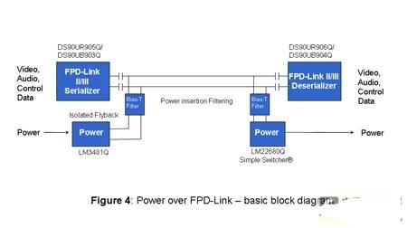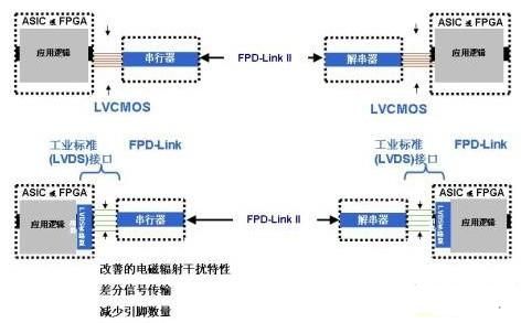 一旦接收器PLL鎖定在發射器的頻率下,即可由LOCK輸出標志引腳顯示這一狀態,確保接收器輸出的數據完整性。DS90UR907/8芯片組具有DS90UR905/6芯片組的一切特性,兩耳區別在于輸入輸出不再是發送LVCMOS信號的并行總線,而是遵照開放的工業標準"FPD-Link"。很多現代化的圖像控制器、顯示定時控制器、ASIC和FPGA都支持這種"一級串行化"技術,它采用適合18bpp的3個數據通道,或者適合24bpp的4個數據通道,每一個都有一路并行時鐘通道。電信號的發送遵循開放的ANSI/TIA/EIA-644A標準,該標準又稱作"LVDS"(低壓差分信號傳輸)。使用該接口技術代替常規LVCMOS的優勢在于:采用差分信號可降低電磁干擾,并減少組件的引腳數量,如圖3所示。