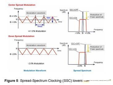 解串器通過一塊集成可配置的擴頻時鐘(SSC)生成器得到增強。在接收器輸出總線端,這會導致輸出時鐘頻率和數據頻譜隨著時間推移而以幾十KHz的低調制率產生輕微變化。如圖5所示,頻率變化可以發生在名義像素時鐘中心頻率附近("中心擴頻調制"),或朝向更低的頻率("向下擴頻調制")。頻譜擴展百分比可高達±2%。擴頻時鐘將峰值能量分散在更寬的頻譜范圍內,從而大大降低了電磁干擾噪聲水平,而不是在同一時間點上、以恒定頻率來轉換所有輸出,此時的輻射噪聲集中在一個窄頻段內,所有輸出數據都與輸出時鐘同步,這使得數據和時鐘得到有效擴展。特別是DS90UR906接收器輸出具有低壓(LV)CMOS接口選項,可以大大降低電磁輻射。