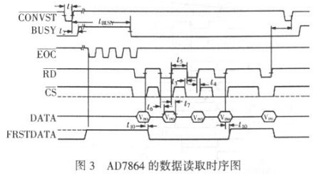 (1)低頻部分。本部分主要采集的是電源信號和電平變換信號,采用AD7864 作為采集芯片。AD7864 具有片內(nèi)時(shí)鐘、讀寫允許邏輯、多種通道選擇方式以及內(nèi)部精確的2。5 V 參考電壓,這使得其與高速處理器的接口變得非常簡單。AD7864 轉(zhuǎn)換后的數(shù)據(jù)讀取采用轉(zhuǎn)換后讀取數(shù)據(jù)的方式,其讀取時(shí)序見圖3。