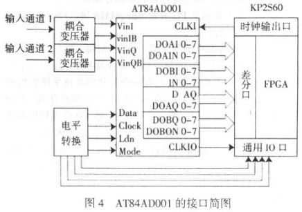 (2)高頻部分。主要是對脈沖數(shù)字信號的采集,包括頻率測量和信號采集兩個(gè)部分。脈沖數(shù)字信號的頻率是確定電路板是否工作正常的重要參數(shù),因此確定脈沖信號的頻率是否正常是本測試系統(tǒng)的必要工作。本系統(tǒng)是將待測信號接入FPGA 與53MHz 的高精度時(shí)鐘同時(shí)開始計(jì)數(shù),一段時(shí)間后,通過兩個(gè)信號的計(jì)數(shù)值來計(jì)算脈沖信號頻率的。信號采集是以AT84AD331 作為采集芯片。AT84AD331 與EP2S63 的連接見圖4。