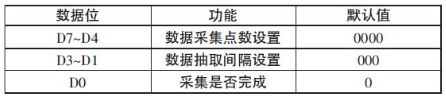 其中D7~D4 為數(shù)據(jù)采集的點(diǎn)數(shù)設(shè)置,3333B 表示64 個(gè),1111 表示1 324 個(gè),步進(jìn)為64。D3~D1 為數(shù)據(jù)抽取的間隔設(shè)置,333 表示抽取間隔為3,全部數(shù)據(jù)有效;111 表示抽取間隔為28,即每隔28 個(gè)點(diǎn)抽取一個(gè)點(diǎn),步進(jìn)為4。設(shè)置這幾位的目的是為了適應(yīng)信號頻率的要求,防止采集數(shù)據(jù)不足一周期的狀況發(fā)生。D3位為標(biāo)志位,功能和操作與5 bit 的寄存器的對應(yīng)位完全相同。本寄存器分高4 位和低4 位兩次設(shè)置。