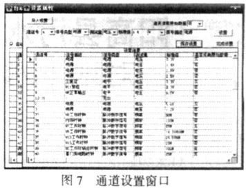 設(shè)置窗口見圖7,本窗口中可以設(shè)置每一路信號的屬性,也可以直接調(diào)出以前保存的設(shè)置,設(shè)置完成后即可按該設(shè)置進(jìn)行測試。設(shè)置完成后,可以將本次的設(shè)置保存成文件,以便下次直接調(diào)出。