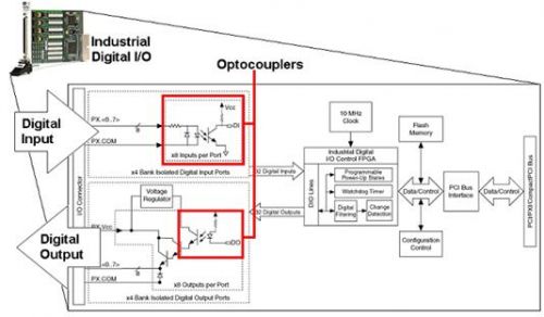 光耦合器,即基于光耦合原理的數字隔離裝置,是最古老也是最常用的數字隔離方法之一。它們可耐高壓并提供對電氣噪聲和磁噪聲的高抗干擾能力。光耦合器常用于工業數字I/O產品中,如NI PXI-6514隔離式數字I/O模塊(如圖10所示)和NI PCI-7390工業運動控制器。