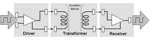感應隔離技術使用了一對通過一個絕緣層分離的線圈。該絕緣層防止任何物理信號的傳輸。信號可以通過改變流經其中一個線圈的電流進行傳輸,因為這樣會使跨過該絕緣層在第二個線圈中產生類似的感應電流。感應隔離技術可以提供與電容技術相似的高速傳輸。但是由于感應耦合涉及到用于數據傳輸的磁場的使用,因此它易受到外部磁場的干擾。