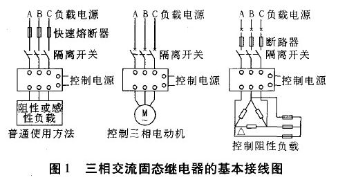 單相SSR為四端有源器件,其中兩個(gè)輸入控制端,兩個(gè)輸出端,輸入輸出間為光隔離,輸入端加上直流或脈沖信號(hào)到一定電流值后,輸出端就能從斷態(tài)轉(zhuǎn)變成通態(tài)。而三相交流固態(tài)繼電器則是集三只單相交流固態(tài)繼電器為一體,并以單一輸入端對(duì)三相負(fù)載進(jìn)行直接開關(guān)切換,可方便地控制l一相交流電機(jī)、加熱器等三相負(fù)載,圖1為三相交流固態(tài)繼電器的基本接線圖。三相交流固態(tài)繼電器的相與相問,輸入輸出間,以及與基板之間絕緣電壓大于2 000 VAC,其他基本指標(biāo)與相應(yīng)的單相固態(tài)繼電器相同。需要指出的是對(duì)實(shí)際負(fù)載電流不大的場(chǎng)合,比如實(shí)驗(yàn)室教學(xué),三相SSR使用起來比較方便,但電流大時(shí)發(fā)熱亦大,這時(shí)使用三只單相SSR更為可靠。