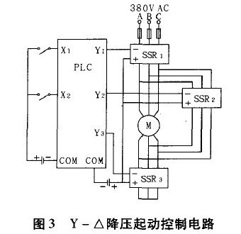 圖3為PLC控制的Y-△降壓起動(dòng)控制電路,其中X1、X2分別表示PLC的輸入,控制電動(dòng)機(jī)的起停;Y1、Y2、Y3表示PLC的輸出。當(dāng)Y1和Y3有效時(shí),對(duì)應(yīng)的SSR1和SSR3也同時(shí)有效,此時(shí)電動(dòng)機(jī)為Y型接法,延時(shí)幾秒后,Y3失效,Y2有效,則對(duì)應(yīng)的SSR3三相輸出端斷開,SSR2三相輸出端合上,則電動(dòng)機(jī)變?yōu)椤鹘臃ǎ瓿闪薡一△降壓起動(dòng)。