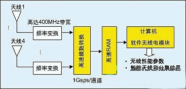 VIPER被設(shè)計(jì)成在最少的RF硬件條件下,在軟件中實(shí)現(xiàn)處理功能。圖4給出了接收器硬件的模塊示意圖。執(zhí)行單階下變頻后,在四個(gè)信道的每一個(gè)信道的IF信號(hào)以每秒1G的采樣率被采樣。所采集樣本信號(hào)存儲(chǔ)在RAM中,并由計(jì)算機(jī)處理。
