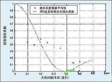 利用所開發(fā)的硬件測試平臺(tái)進(jìn)行了廣泛的測量,包括手機(jī)分集測量、天線間隔和操作員身體對(duì)分集的影響、自適應(yīng)波束形成、到達(dá)角、信道互易驗(yàn)證,以及寬帶向量信道測量。圖5和圖6給出了戶外非直線可視信道的采樣分集測量。圖5對(duì)比相對(duì)于天線間隔的相關(guān)系數(shù),注意到當(dāng)相關(guān)性遠(yuǎn)低于0.7時(shí)將十分有利于提高分集性能。圖6給出了分集增益與天線間隔的函數(shù)關(guān)系:99%可靠性時(shí),增益約9dB;90%可靠性時(shí),增益約5-dB。當(dāng)間隔降至0.1波長時(shí),幾乎沒有關(guān)聯(lián)關(guān)系了。