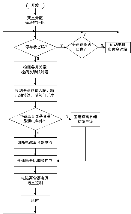 TCU控制系統主程序框圖如圖3所示。程序首先對內部RAM進行分配,然后對各功能模塊如Administrator/D轉換器、定時器、PWM波形發生器等進行初始化。變速箱的變比在汽車每次時應處于最小變比的位置,因此在每次停車時應將變速箱歸位,汽車起動后首先檢測各參數,如檔位開關、發動機轉速、節氣門開度、變速箱輸入、輸出軸轉速等。這些參數是控制電磁離合器電流和電動機狀態的依據。當需要增加變速箱的變比時,TCU控制電機正轉,反之控制電機反轉。電磁離合器的控制采用電流增量控制方式。它的控制好壞,直接影響汽車運行的平穩性和經濟性。