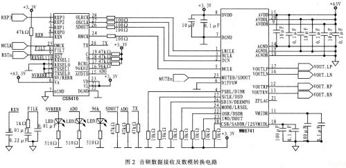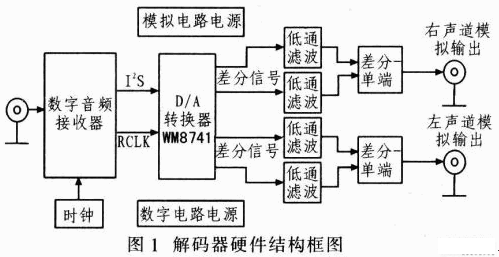 圖1是該解碼器硬件結(jié)構(gòu)框圖,其中數(shù)字音頻接收器采用CirrusLogic公司的高速數(shù)字音頻接收器CS8416,該器件支持包括S/PDIF在內(nèi)的多種音頻輸入,取樣頻率范圍為32~192kHz。CS8416通過(guò)I2S接口與WM8741相連接。I2S總線只處理音頻數(shù)據(jù),其他控制信號(hào)必須單獨(dú)傳輸。CS8416的工作原理:接收器把接收到的S/PDIF格式的數(shù)字音頻數(shù)據(jù)進(jìn)行解碼轉(zhuǎn)換,同時(shí)重建音頻數(shù)據(jù)中的時(shí)鐘并提供給后續(xù)WM8741,音頻數(shù)據(jù)則通過(guò)I2S總線接口發(fā)送給WM8741。WM8741按照設(shè)定的參數(shù)完成數(shù)模轉(zhuǎn)換后,再以差分形式輸出左右通道的模擬音頻信號(hào),并經(jīng)低通濾波器濾除高頻諧波噪聲,最終得到高質(zhì)量模擬電壓信號(hào)。如果輸出接口為RCA,還需將差分信號(hào)轉(zhuǎn)換為單端信號(hào)。