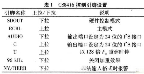 CS8416是數(shù)字音頻信號(hào)接收電路的核心。在軟件控制方式下,MCU通過(guò)SPI或I2C接口沒(méi)置參數(shù)。該方式還可靈活更改內(nèi)部配置。在無(wú)MCU時(shí)則通過(guò)硬件控制方式改變其特定引腳電平實(shí)現(xiàn)控制。由于本系統(tǒng)中無(wú)MCU,因此采用硬件控制方式。在SDOUT引腳上用一只47kΩ電阻下拉至地即可,且引腳AUDIO、RCBL、U、C等不能懸空,必須通過(guò)一只47kΩ電阻上拉至高電平或下拉至低電平,以便系統(tǒng)復(fù)位后,CS8416通過(guò)檢測(cè)這些引腳電平?jīng)Q定其工作狀態(tài)。表1為該系統(tǒng)設(shè)計(jì)的控制引腳的配置。