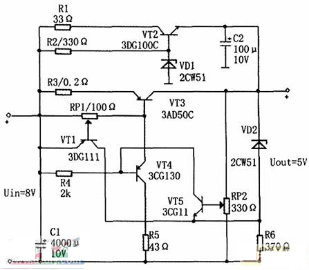 三極管VT2基極電壓預先由穩(wěn)壓二極管VD1給定小于5v的電平,這樣當穩(wěn)壓器進入工作狀態(tài)時,VT2截止,負載電流只通過調整管VT3。