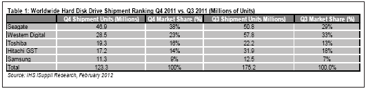 據(jù)IHS iSuppli公司的存儲市場簡報,2011年第四季度希捷重新奪回硬盤(HDD)出貨量的第一排名。此前七個季度西部數(shù)據(jù)一直保持第一,但去年的泰國洪災(zāi)令其損失慘重。