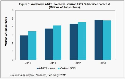 據IHS Screen Digest的研究報告,2011年第四季度美國電話電報公司(AT&T)的Uverse服務新增用戶數量,多于對手Verizon的FiOS服務。這是AT&T在競爭激烈的付費電視領域連續第10個季度戰勝Verizon。