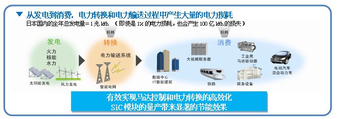 此產品安裝在工業設備和太陽能電池等中負責電力轉換的變頻器、轉換器上,與普通的Si(硅)材質的IGBT模塊相比,具備以下優勢,有效解決了世界能源和資源等地球環境問題。