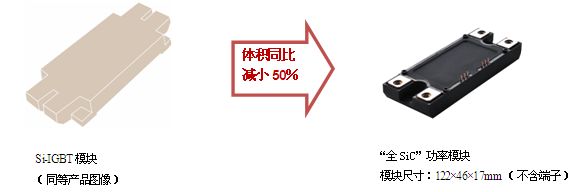 不僅如此,通過設計和工藝的改善,羅姆還成功開發出散熱性卓越的模塊。替換傳統的400A級別的Si-IGBT模塊時,體積可減小約50%。由于損耗低,因此發熱少,可減小外置的冷卻裝置體積,從而非常有助于設備整體的小型化。